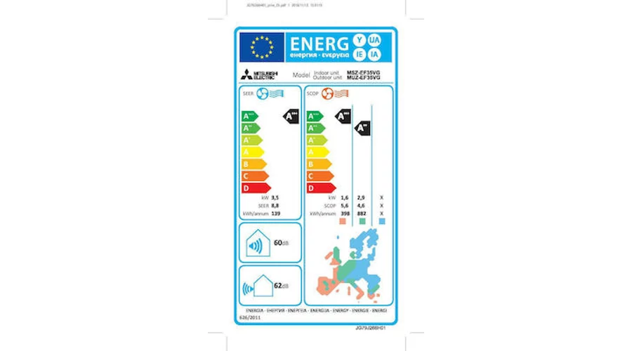 Az MSZ-EF Oldalfali készülékek a legjobb energiahasznosítási értékeket érik el. A jövőbe mutató inverteres technológiának köszönhetően a Mitsubishi Electric díjnyertes Oldalfali klímaberendezései a legmagasabb hatásfokot érik el, amely már ma teljesíti az Ökodesign irányelv szerinti A+++ energiahatékonysági osztály követelményeit.