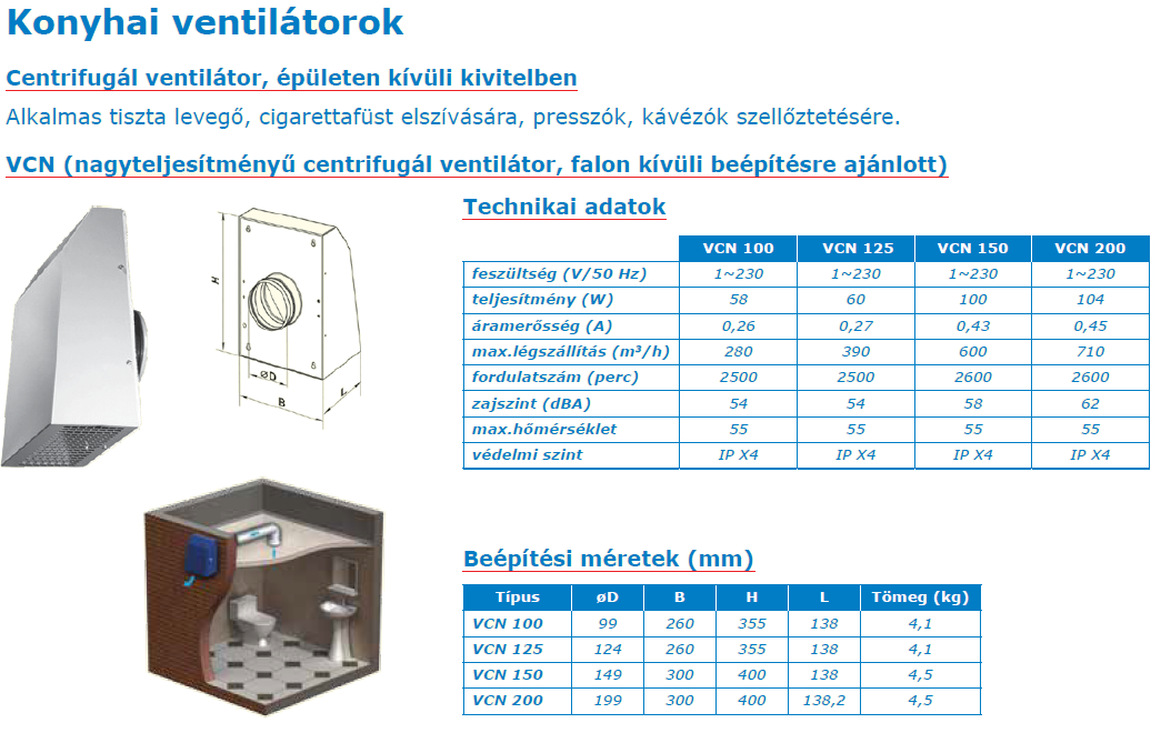 Külső fali, radiál lapátozású elszívó ventilátor. Na 100 csőhöz.
